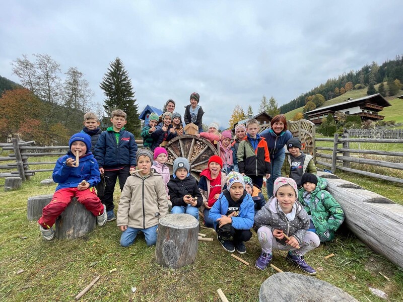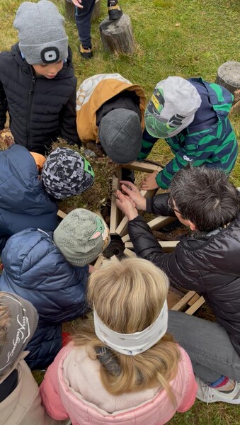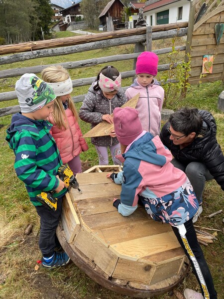 Das Füllmaterial (Äste, Zapfen, Moos...) wurde zuvor von den Kindern beim Wandertag gesammelt. Gemeinsam wurden die Fächer des Insektenhotels sorgfältig mit den gesammelten Materialien ausgestaltet, um Wildbienen, Käfern und anderen nützlichen Insekten geeignete Nist- und Überwinterungsplätze zu bieten. Die Kinder lernten dabei viel über die Bedeutung von Insekten für unser Ökosystem.